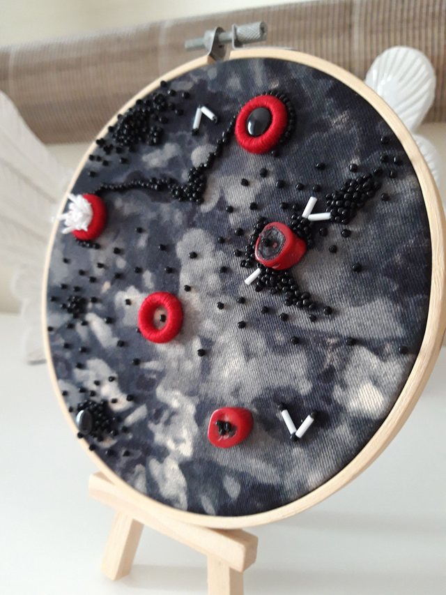 Peça bordada única em tecido, e com pedraria, de 15cm de diâmetro.